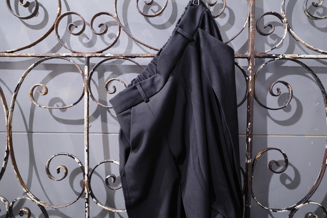 ■ディテール 切りっぱなしで外向きのサイドラインの縫い目がアクセントとなり 抜け感のあるデザイン性 フロントのボックスタックにより 太ももあたりで膨らんでスネのあたりで絞れていく 「繭」のように見えることからコクーンシルエットと呼ばれる サルエル要素も加わりシンプルなスラックスとの差別化を図るモードテイストな一着です 男女問わずオススメです ■素材:ポリエステル80 レーヨン12 ポリウレタン8 ■カラー:グレー(着用はブラック) ■サイズ:フリー 総丈 100 ウエスト 70- ヒップ 106 股上 44 股下 61