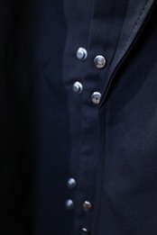 襟無しジャケットの上にテーラードジャケットを重ね着したようなフェイクレイヤード
