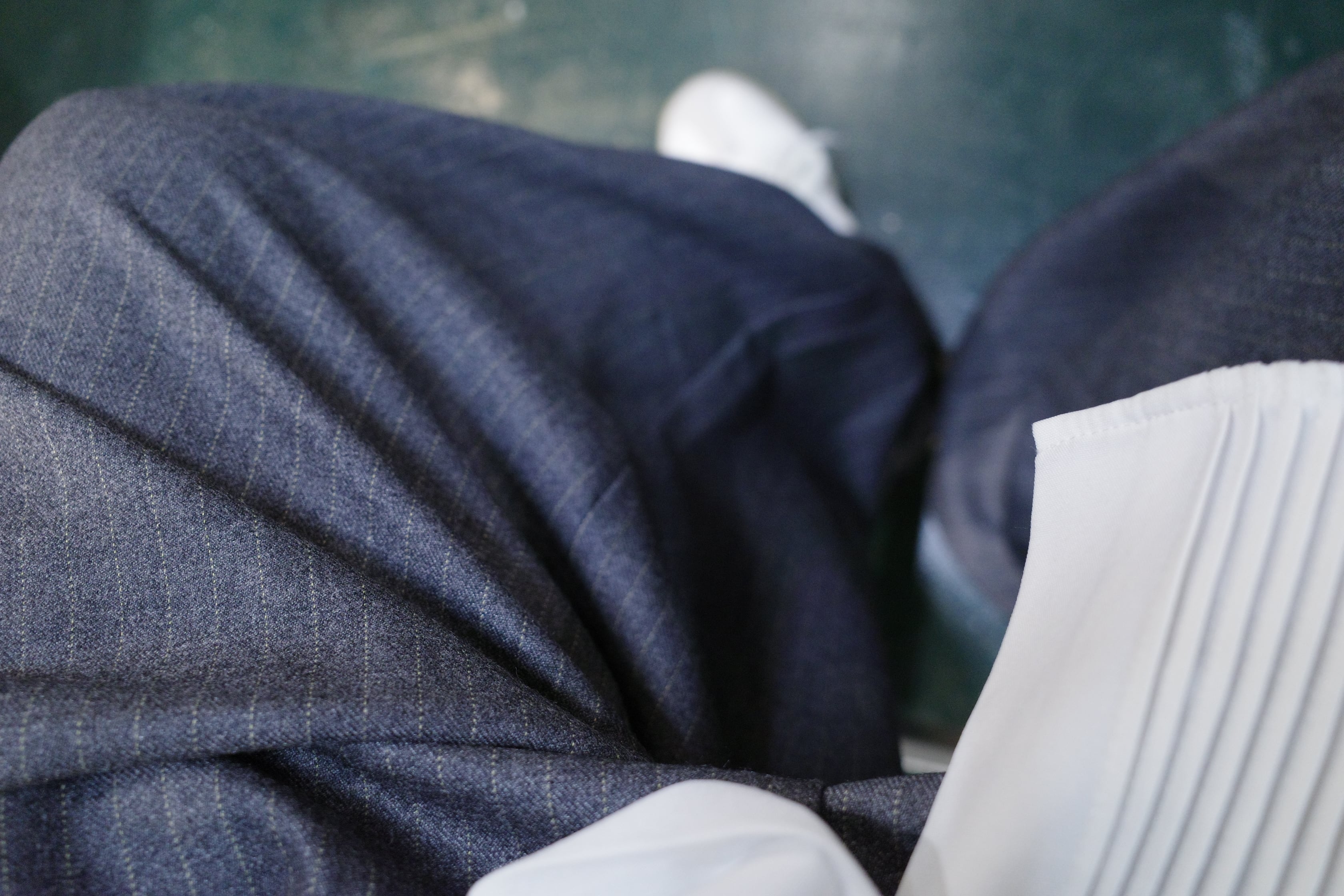 エレガントなスラックス生地はやや厚みのあるウール混素材