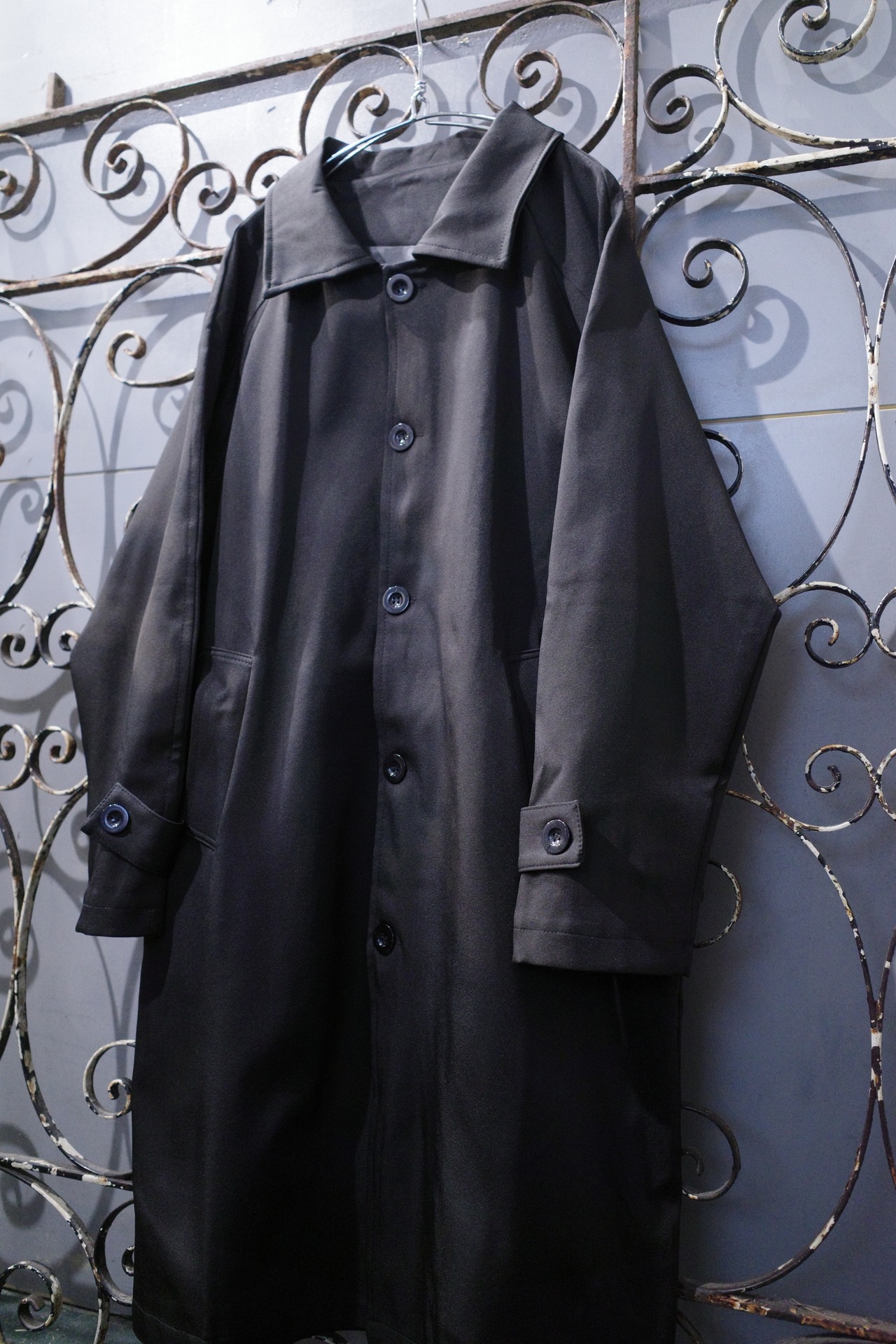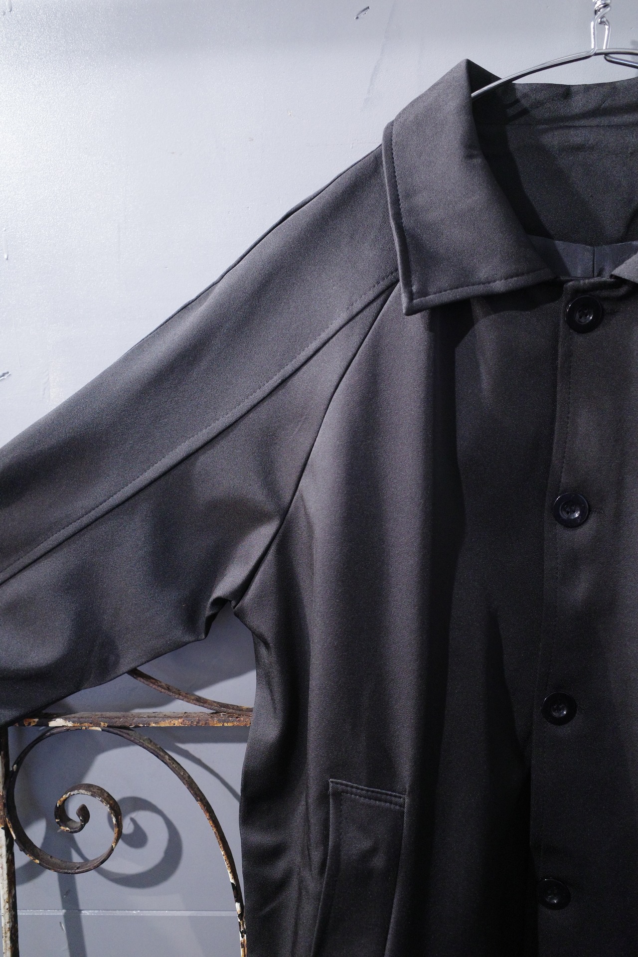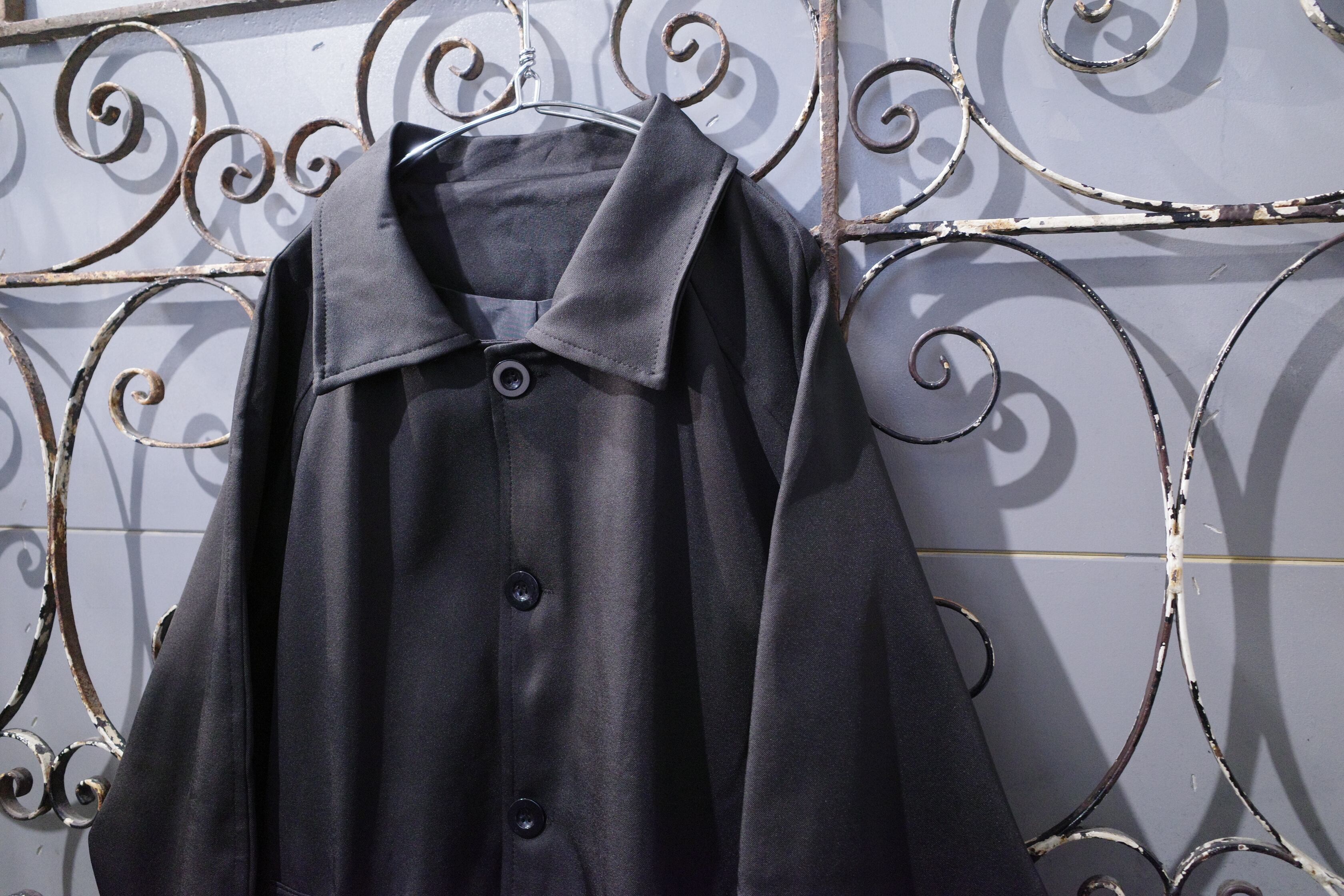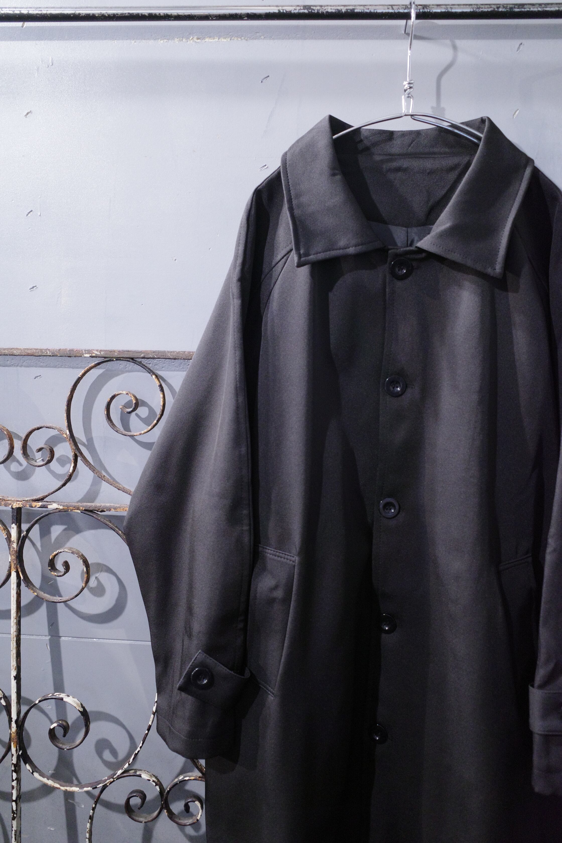 ジャージのようなストレッチ性に優れた大きめ襟が特徴的なステンカラーコート